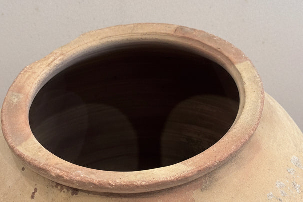 This original, solid and heavy vessel is exactly as shown. Originally used to store olive oil, it’s a one-of-a-kind piece that has weathered uniquely over time. Gathered layers of sediment paint and patina make it a stunning display piece.