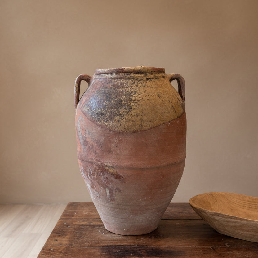 This original, solid and heavy vessel is exactly as shown. Originally used to store olive oil, it’s a one-of-a-kind piece that has weathered uniquely over time. Gathered layers of sediment paint and patina make it a stunning display piece.