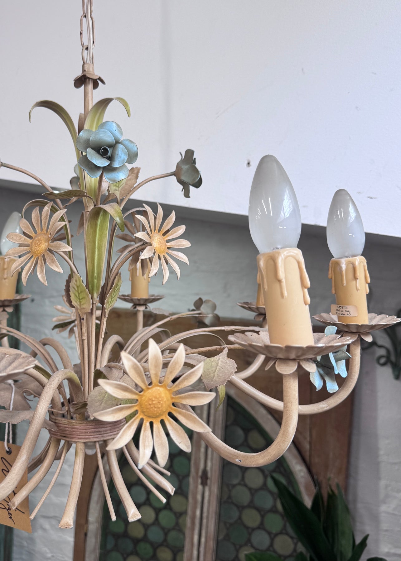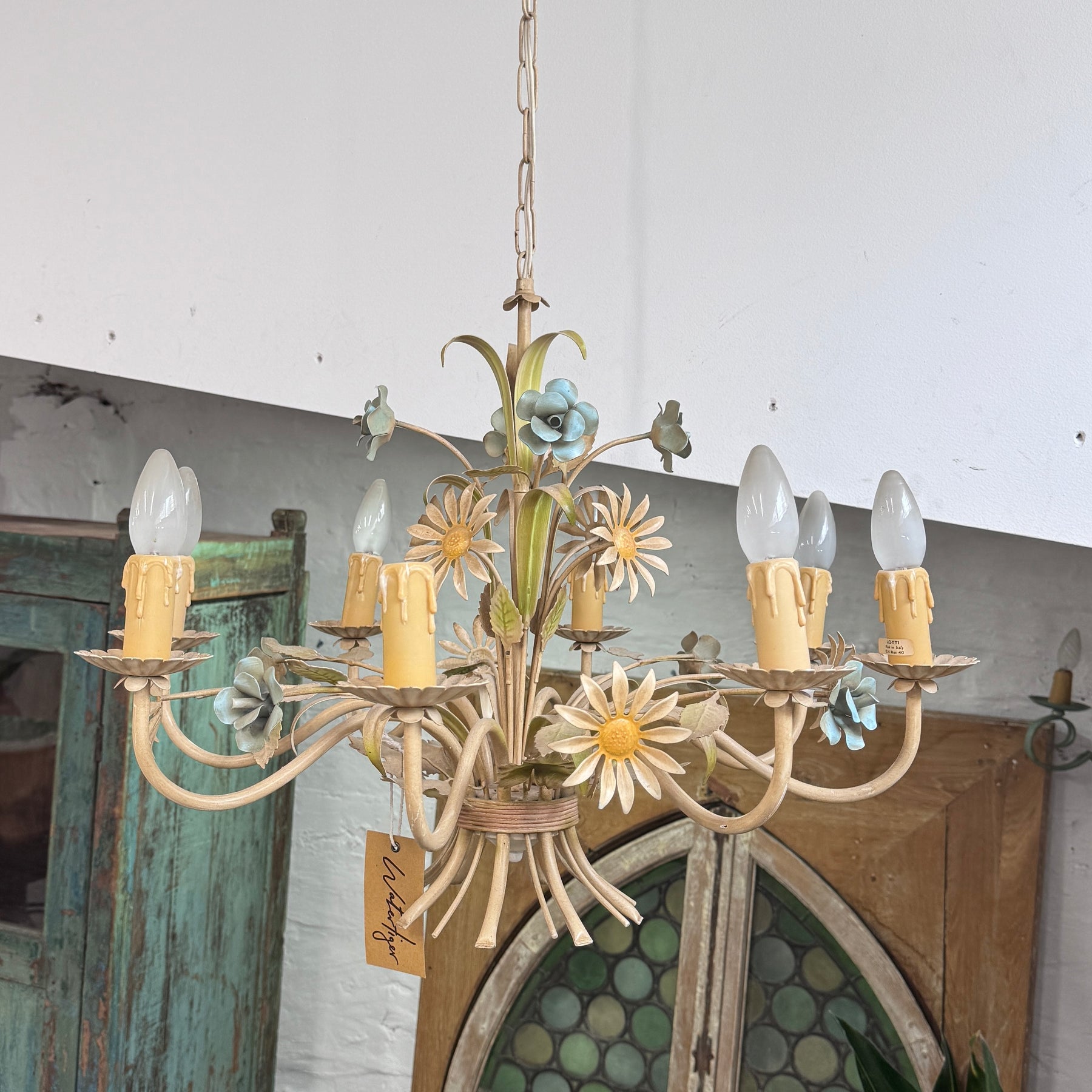 A large-sized French wrought iron and tole-work eight arm chandelier.  The eight expertly decorated scrolling arms are adorned with flowers in bloom and leaves, and have been hand-painted in soft colours.