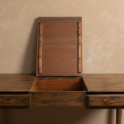 Handcrafted from solid teak and sourced from Rajasthan, this Anglo Indian Colonial desk combines authentic heritage with everyday versatility. Two brass-handled drawers provide practical storage, while the naturally aged wood finish showcases the character of genuine craftsmanship.  Complete with a built in - lift up, lidded storage area.  Great for storing your work papers or storing napkins etc. should you like to use this as a dining table;