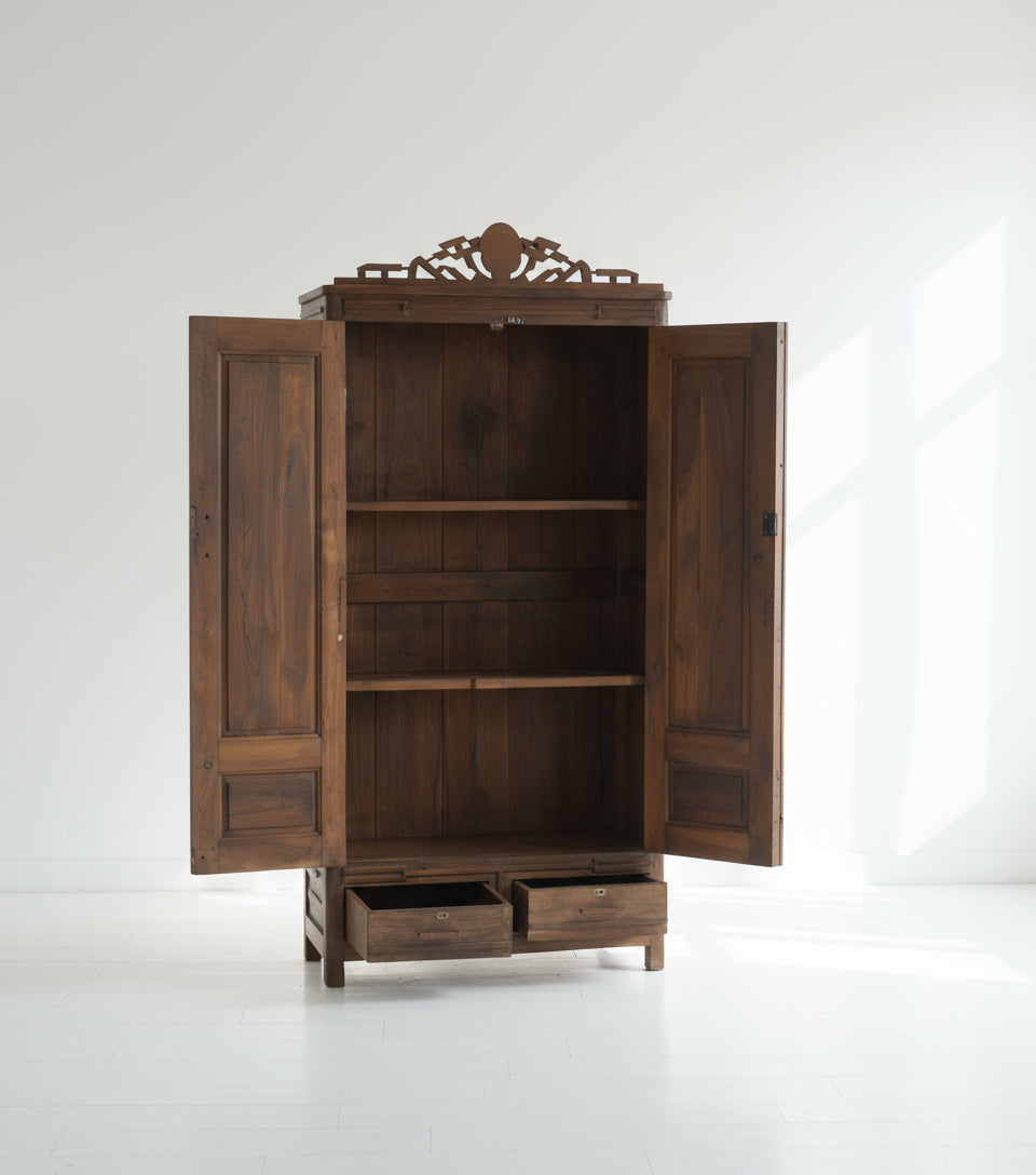 This wardrobe is as functional as it is decorative. The rich, warm patina of the aged teak brings depth and authenticity to the surface, making it ideal as a statement piece in a modern or traditional interior.