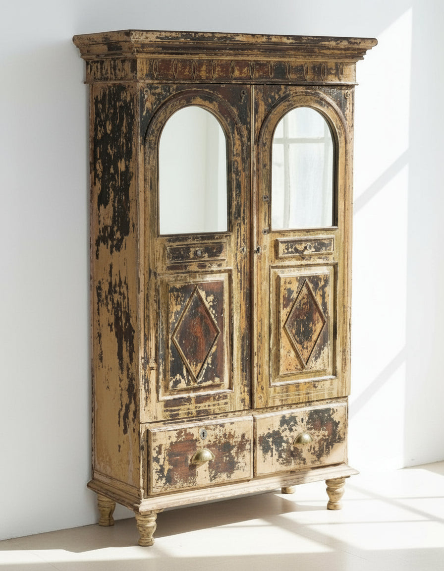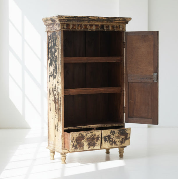 The timeless Indian almirah is a key piece in traditional furniture, known for its vibrant colors and detailed carvings that make storage anything but dull. Features a beautifully worn finish revealing a soft cream underneath, accented with delicate carvings. It brings a cozy, rustic feel and elegant storage to any room it graces.