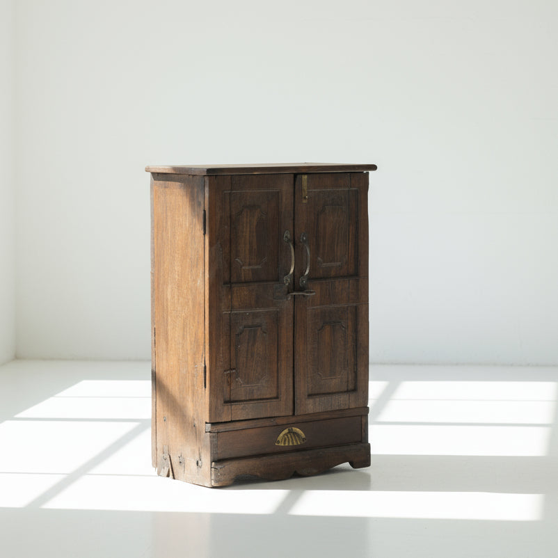 This teak cabinet offers timeless charm with a subtle character. Carefully restored and sourced from Rajasthan, it has solid wooden doors hiding a single shelf—ideal for books or keepsakes—plus a drawer below. Its narrow design makes it perfect as a bedside or lamp table, helping keep your space peaceful and tidy.