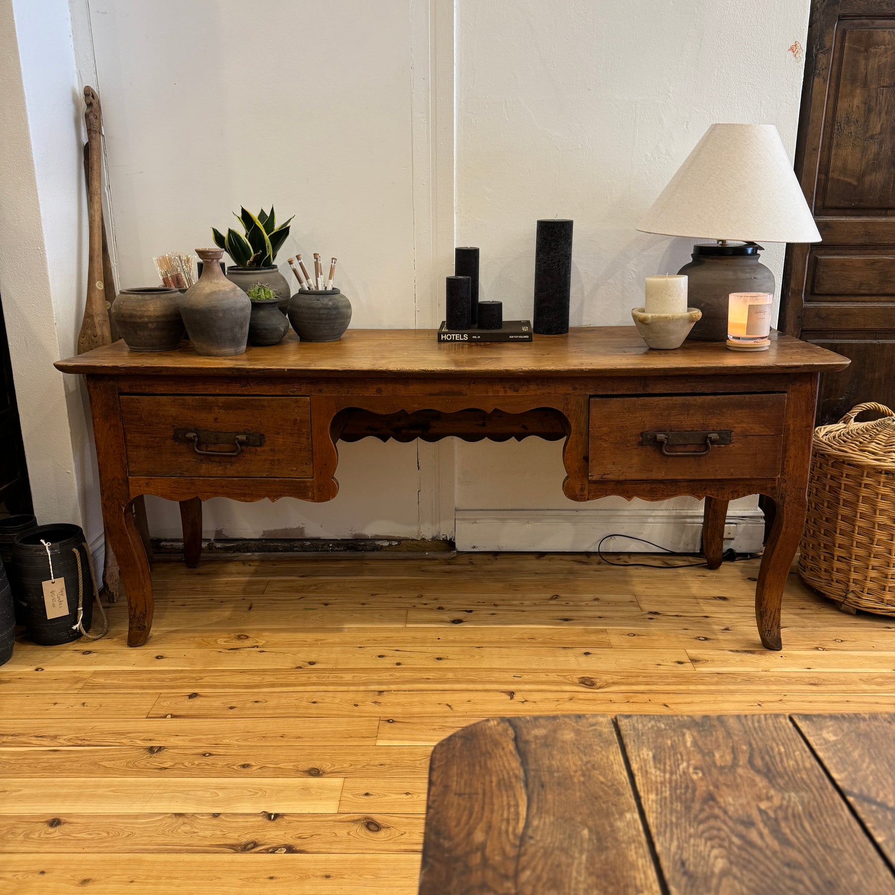 Mid-19th century desk, the rectangular four panel top with a molded edge, above a case fitted with two drawers flanking a kneehole, raised on cabriole legs.