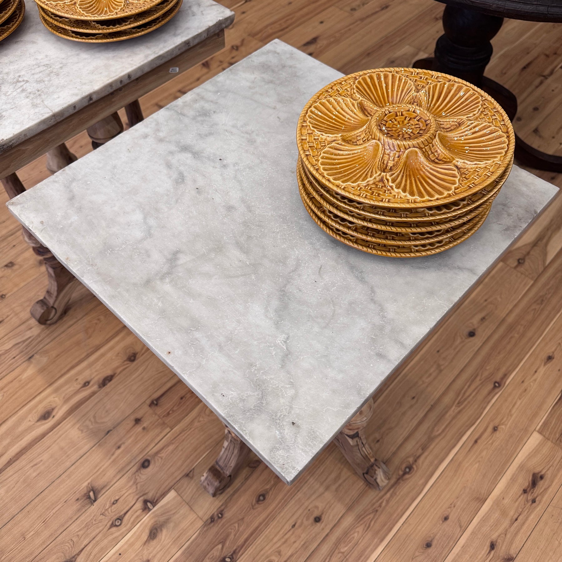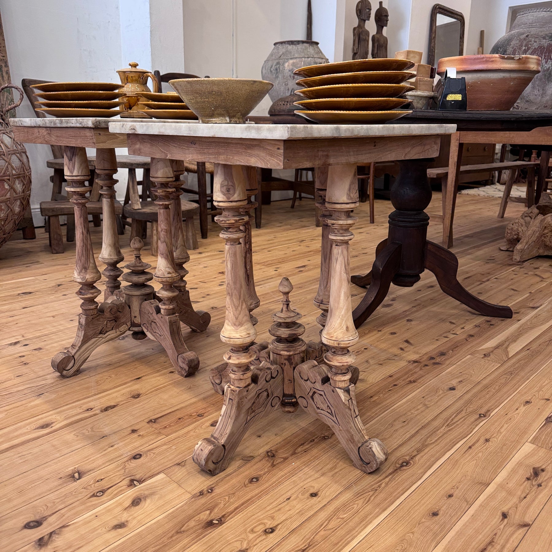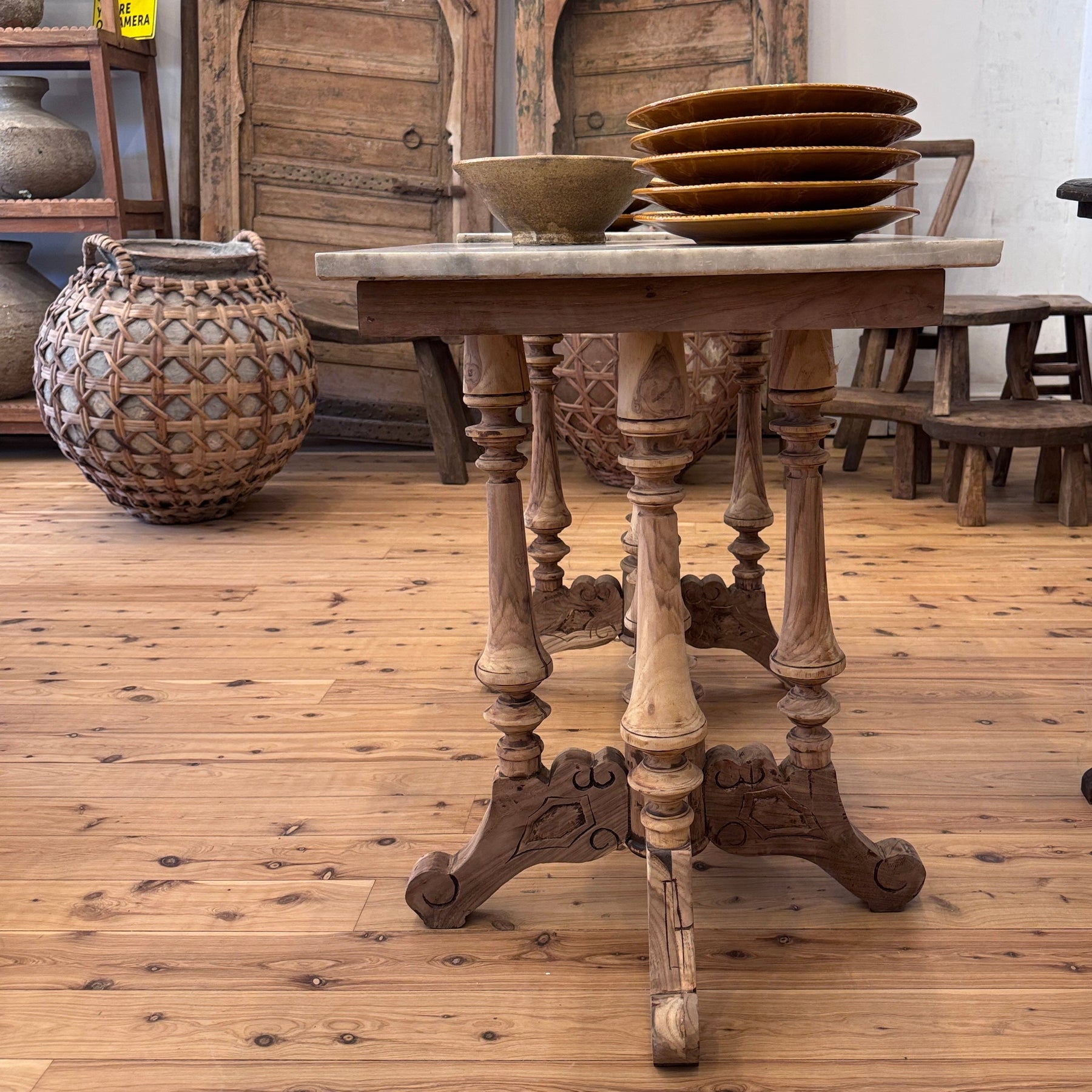 These Indonesian Dutch-style occasional table features a square white marble top resting on a turned birdcage base, complete with a central finial.