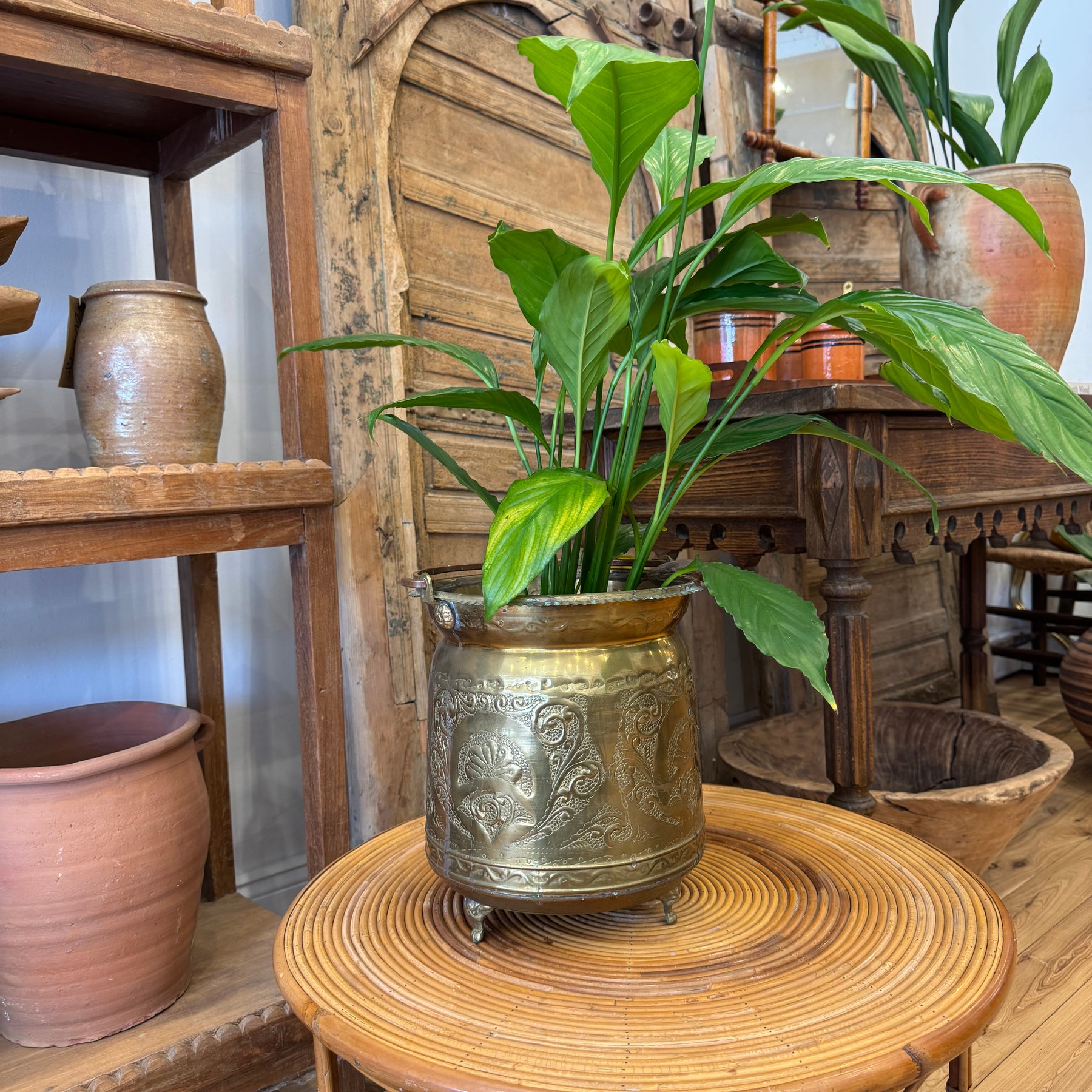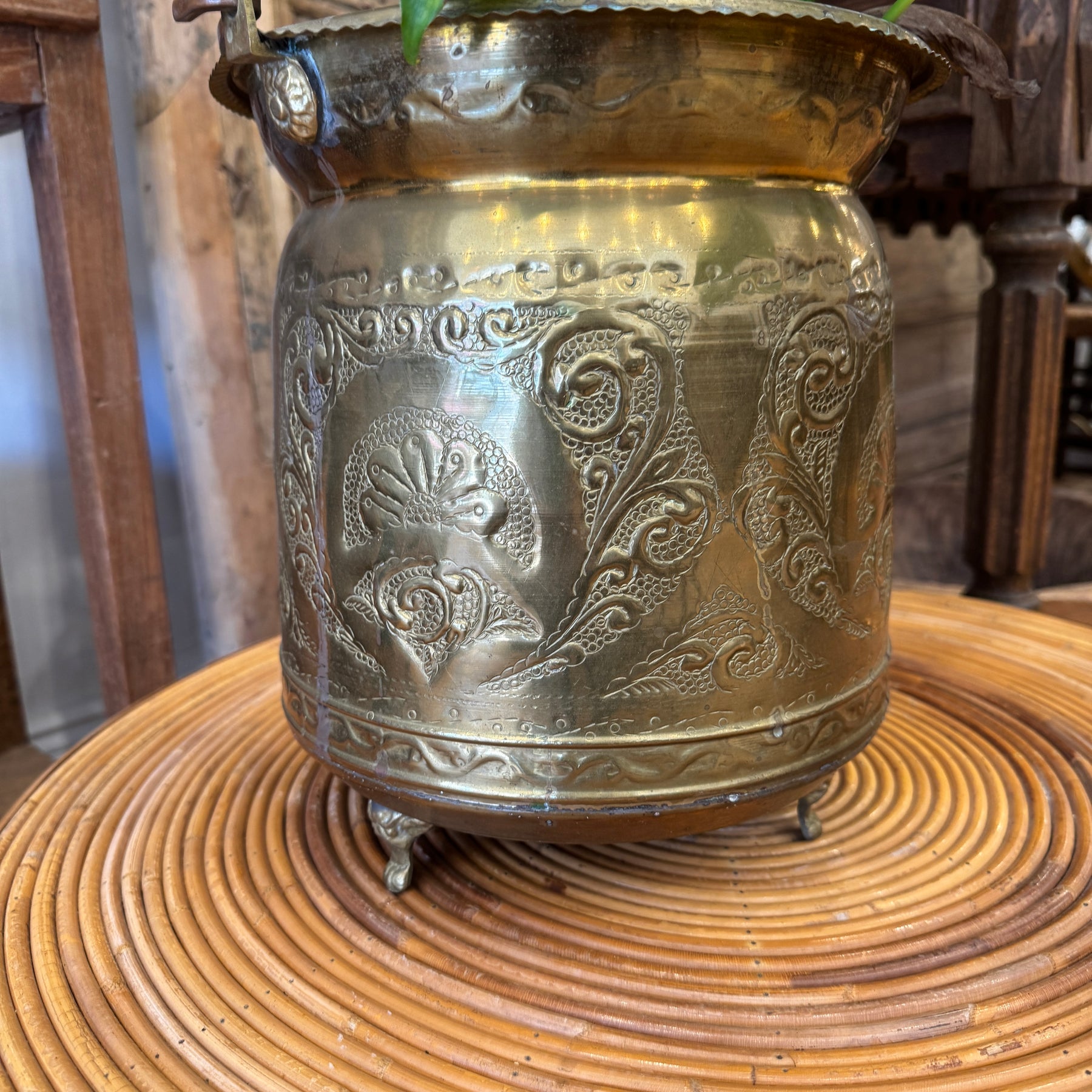 This vintage French brass cauldron serves as a charming jardiniere or cachepot, perfect for showcasing your favorite plants or flowers. Its copper handle and elegant aged brass finish add a warm, inviting touch to any space.